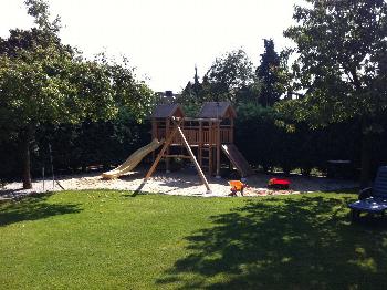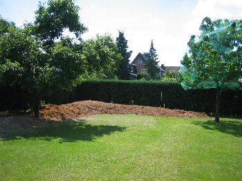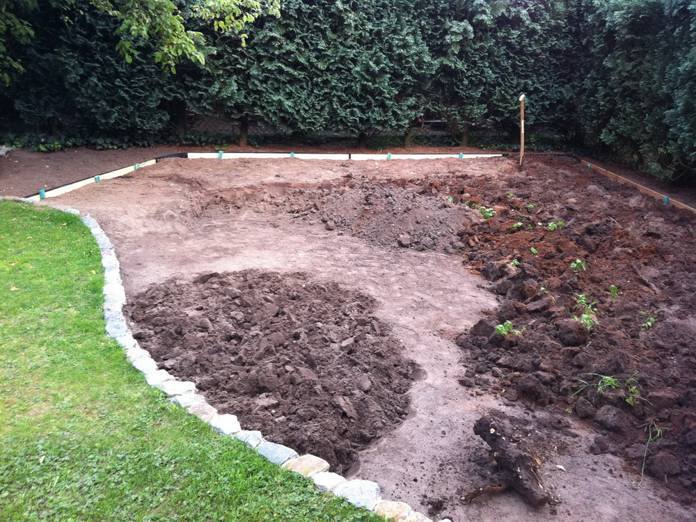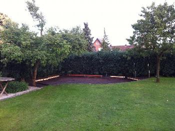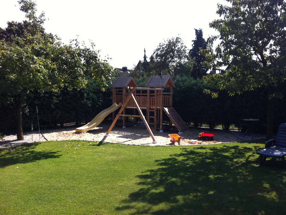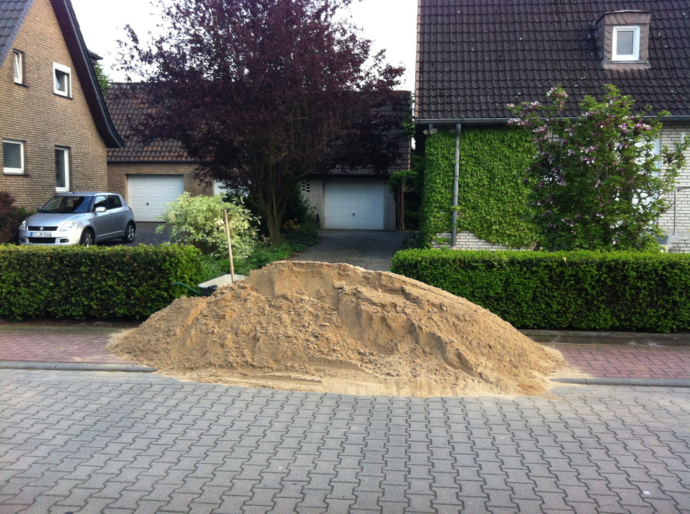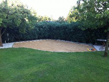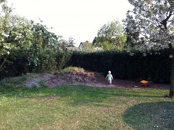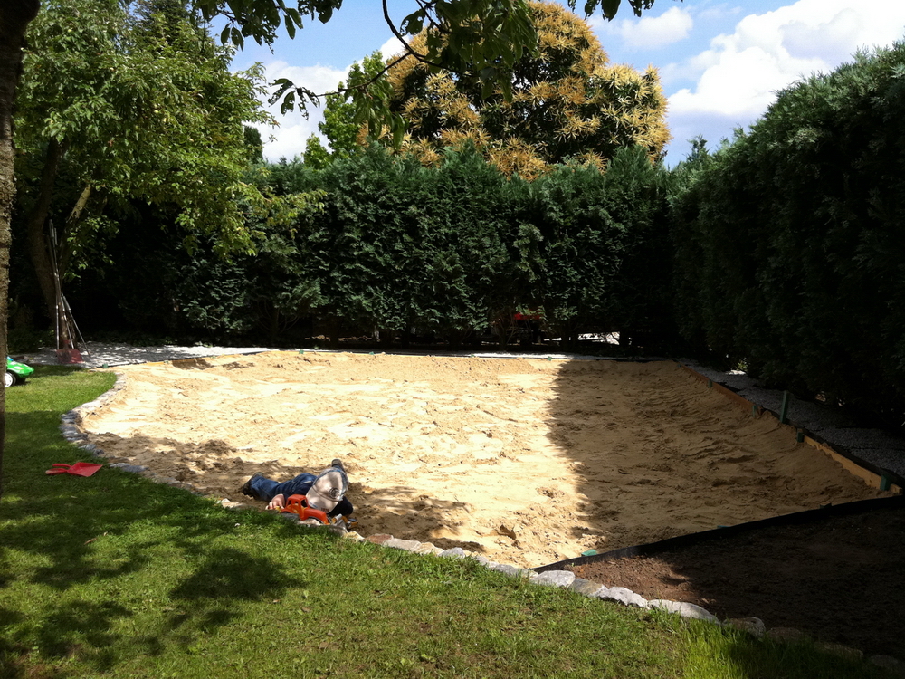 Anlage eines Spielplatzes für unseren "Großen". Insgesamt wurden ca. 30 m³ Erde "händisch" mit einer Schaufel und einer Schubkarre bewegt: ca. 20 m³ "alte" Erde (Aushub des Pools) musste aus dem Garten heraus transportiert und entsorgt (ca. 400 Schubkarren) und dann ca. 10 m³ Spielplatzsand aufgeschüttet werden. In 2012 (Fotos ganz unten) haben wir noch mal ca. 5 Tonnen Sand ergänzt und eine Piratenfahne (mit Betonfundament) aufgebaut.