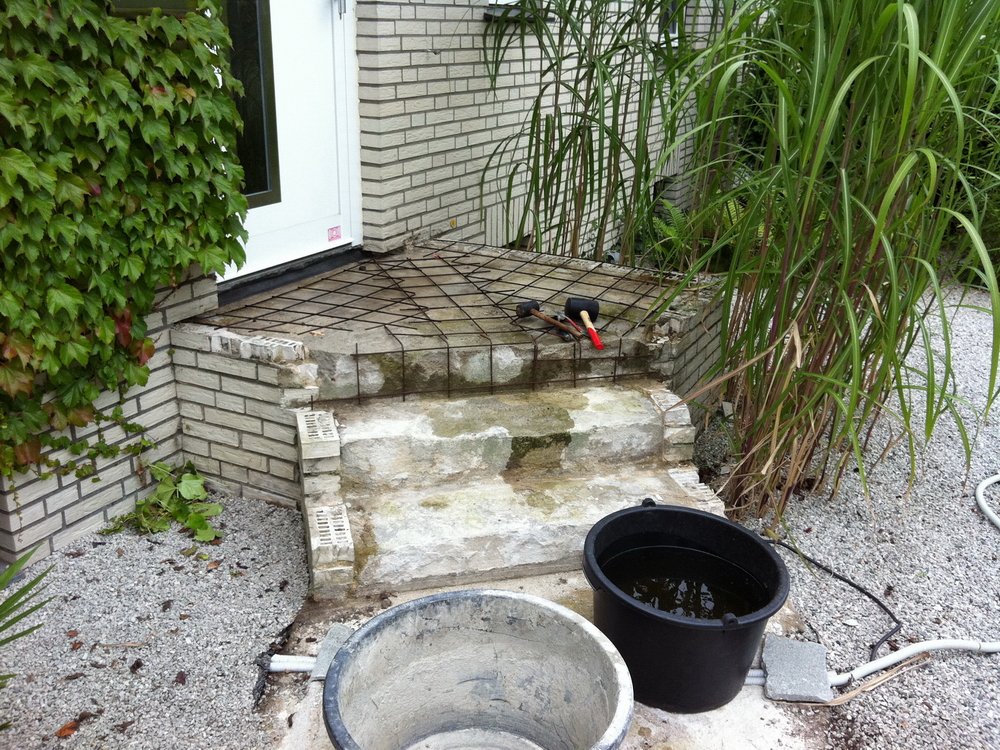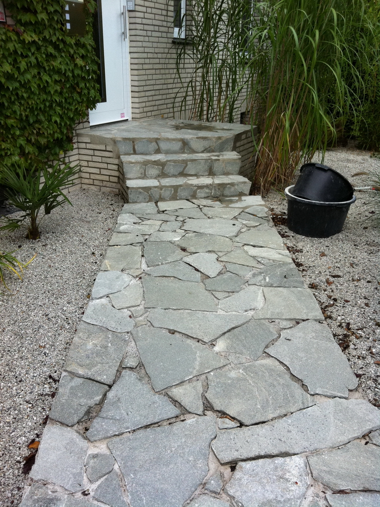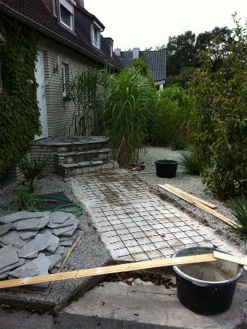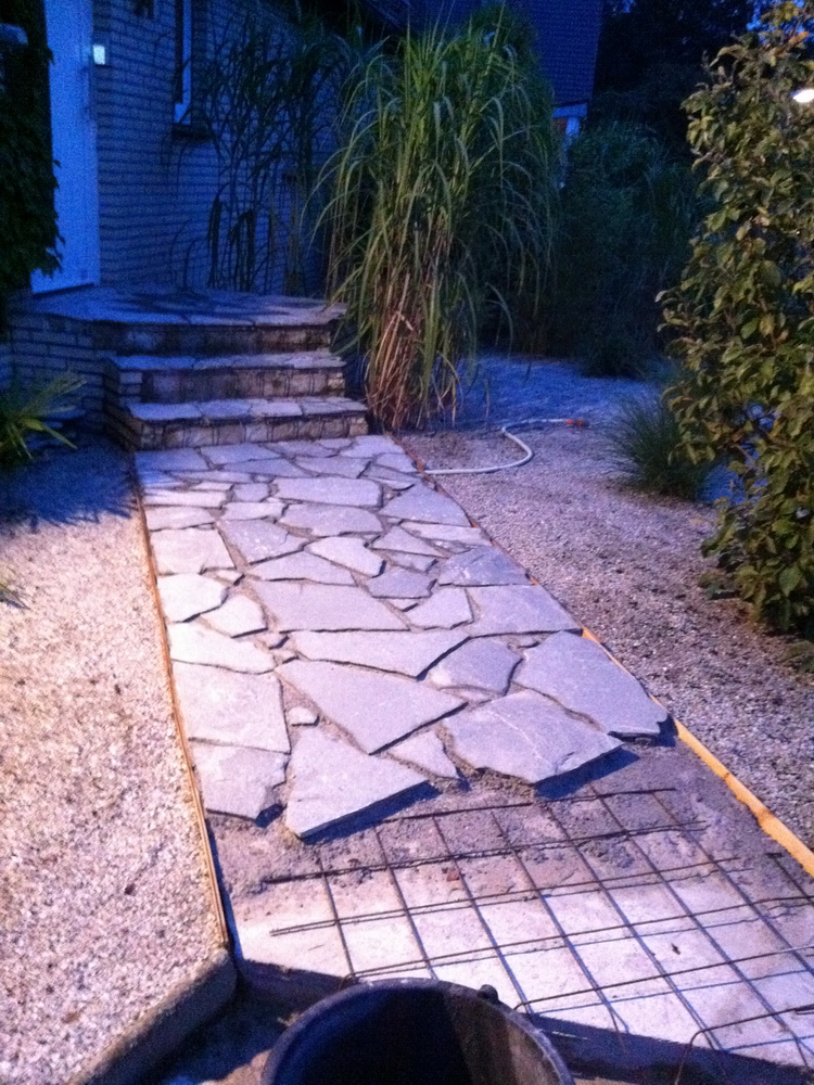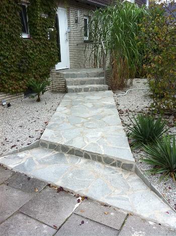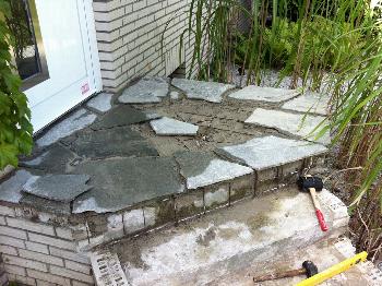 Weg und Treppe zur Haustür aus Porphyr-Platten auf einem vorhandenen Beton-Fundament (fertiggestellt in 10/2011):