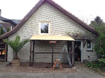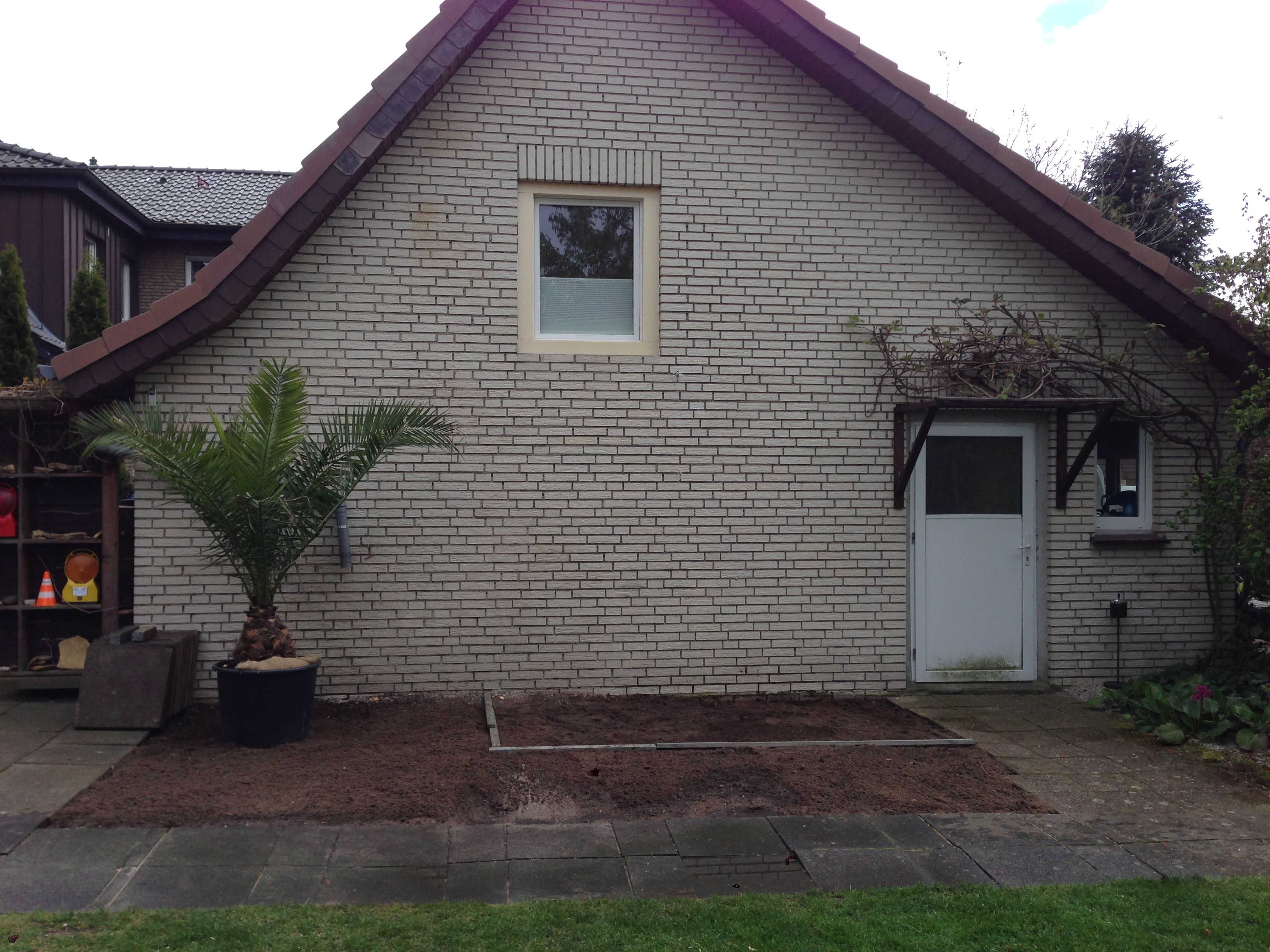 Dann habe ich einige der Beton-Platten entfernt um die Fläche ein wenig zu vergrößern. Auf dem rechten Bild steht das Grundgerüst vorne auf den drei Punkt-Fundamenten und an der Rückseite sind die 8cm x 8cm Balken mit der Garage verschraubt.