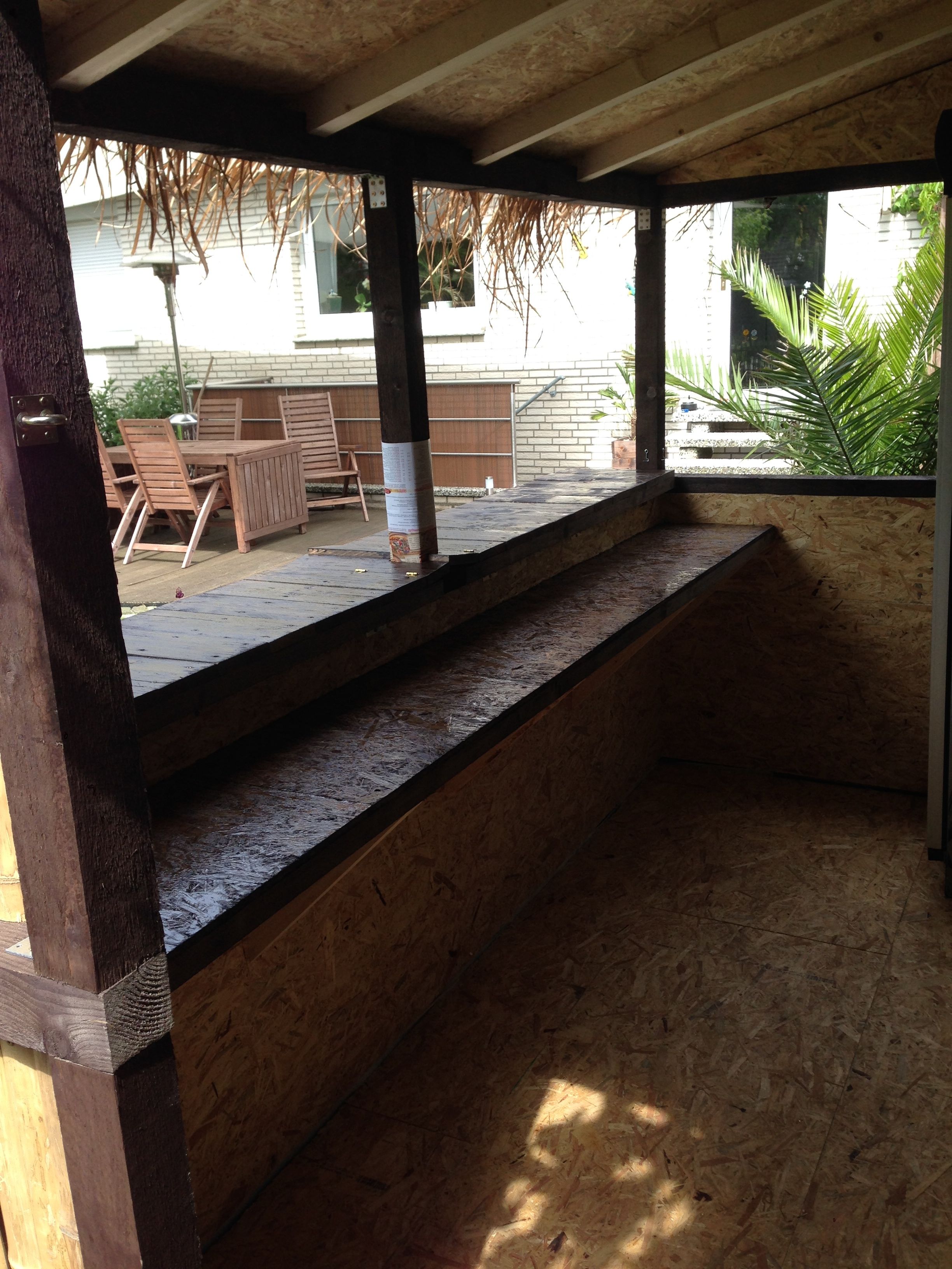 Die Verkleidung: OSB-Platten. Auf dem rechten Bild sieht man die Dacheindeckung aus Palmenblättern (importiert aus Thailand dank eBay...):