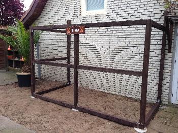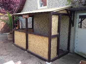 Hier sind die Bambus-Latten schon angebaut, ist die Tür schon drin, sind die abnehmbaren Klappen schon dran und die einklappbare Theke ist schon verschraubt: