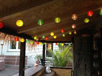 Auch die Barhocker habe ich selber gebaut. Rechts auf dem Foto sieht man noch die Lampion-Ketten in der Bar.