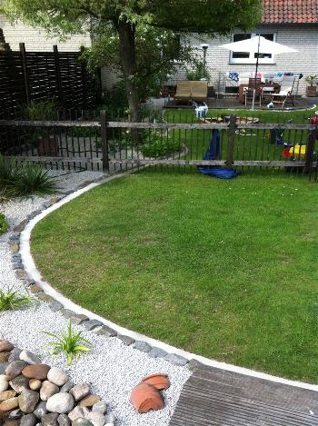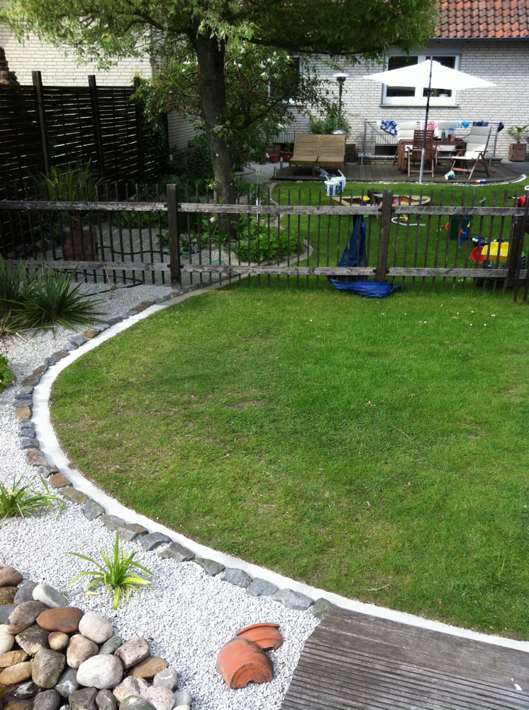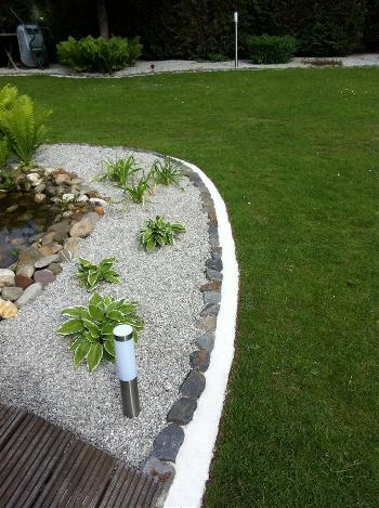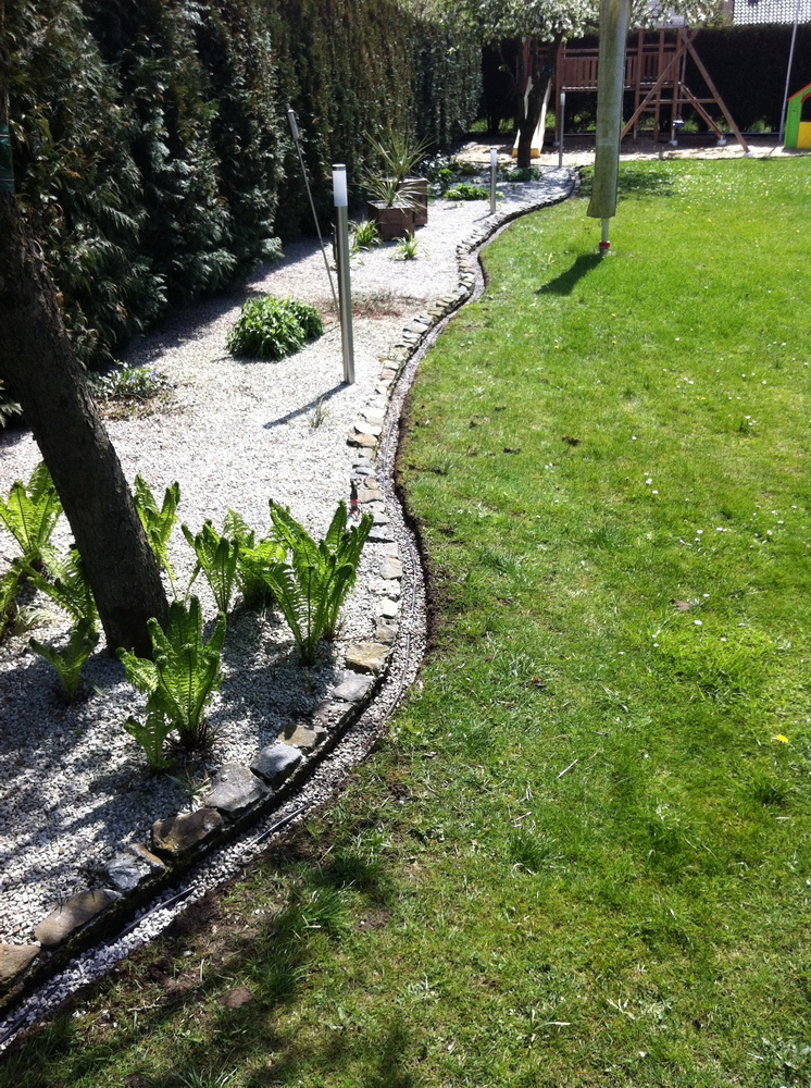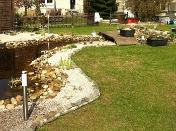 auch im Frühjahr 2012: Bau einer ca. 100 Meter langen Beton-Rasenkante für den Rasenmäher - in dieser wurden auch die Anschlüsse und Kabel der Lampen eingegossen; auf den Fotos auch gut zu sehen: die bereits in 2010 fertiggestellte Abgrenzung aus dem in Beton eingearbeitetem Piesberger Bruchstein: