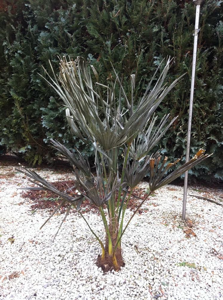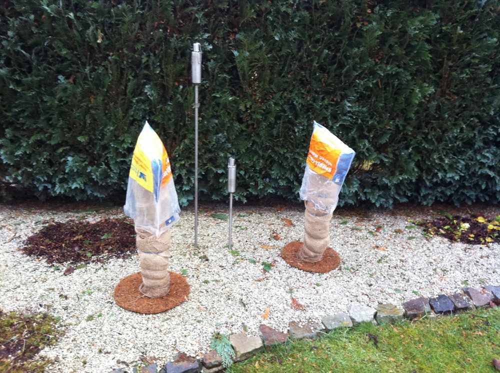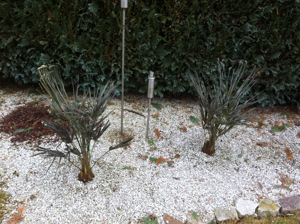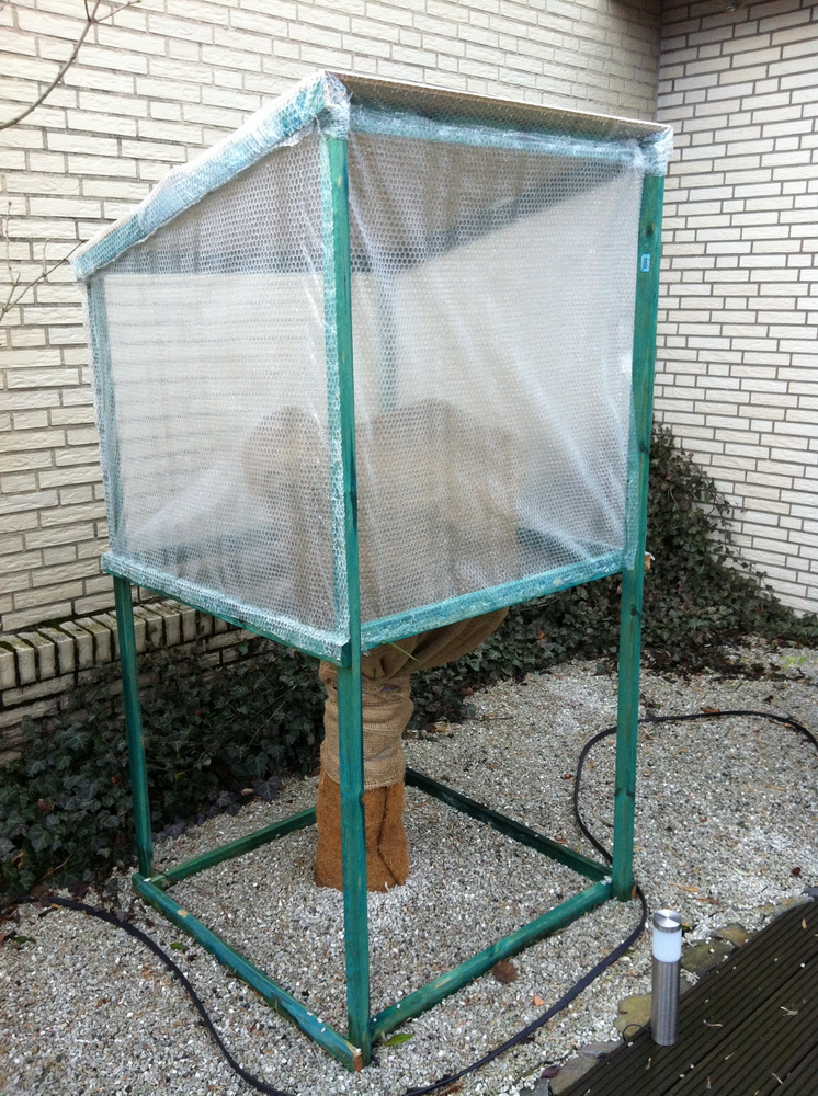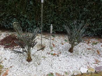 Links im ersten Bild der erste Winterschutz für unsere Trachycarpus Fortunei, Rechts im Bild der Winterschutz 2011/2012 mit Regendach (im Winter 2012/2013 wird die komplette Palme mit einer ergänzten Belüftung so eingepackt...).