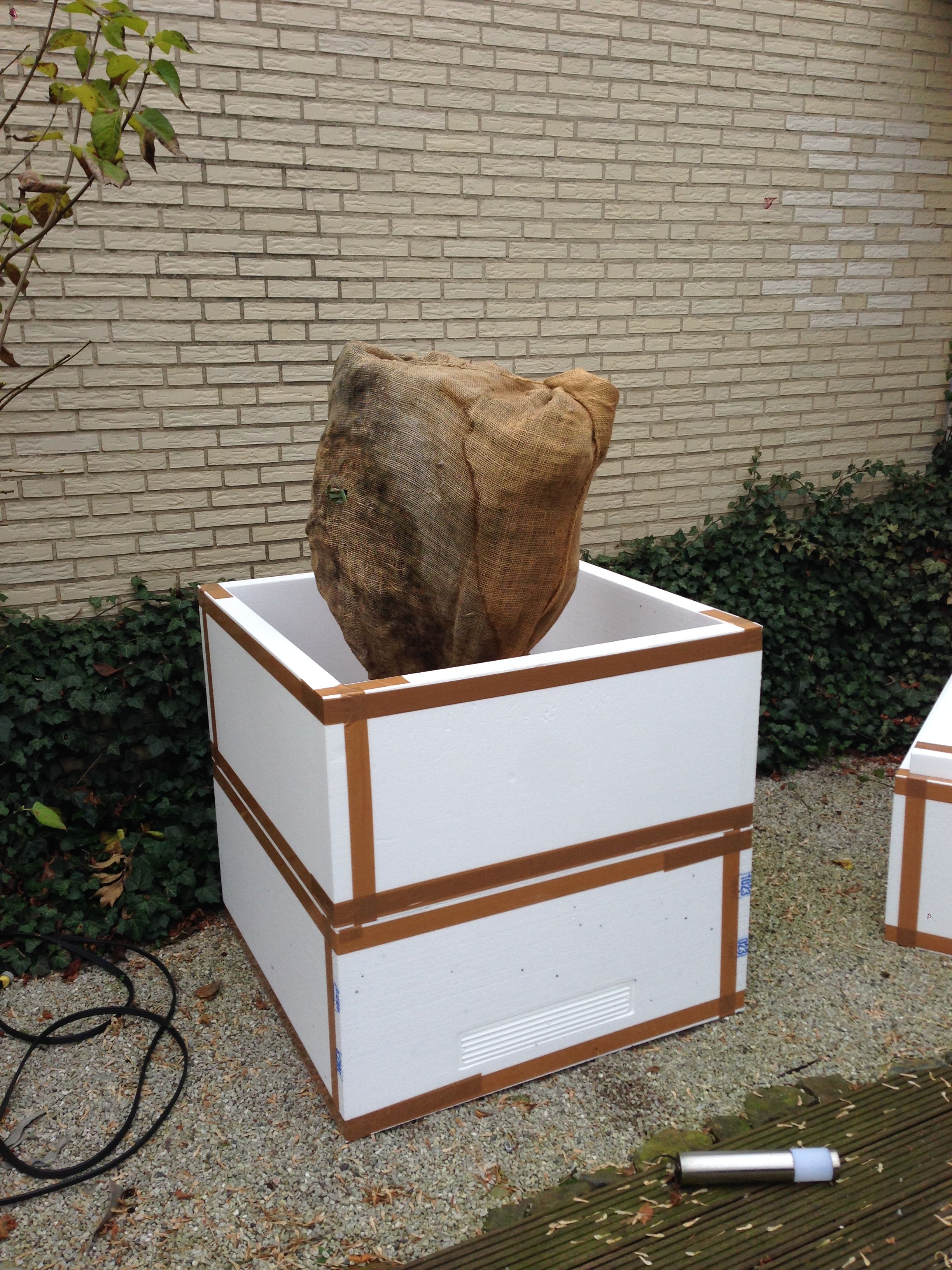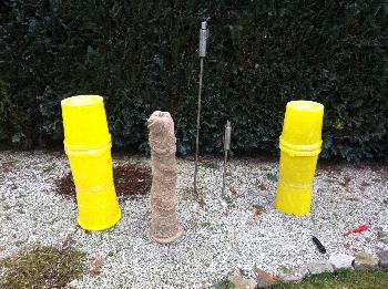 Der erste Winterschutz für die erst im Sommer 2011 (zu spät...) ausgepflanzten Trachys (linkes Foto). Nachdem durch meine fehlerhafte "Konstruktion" die Jute-Umwickelung vollständig mit Wasser vollgesogen war und eine leichte Schimmelbildung begonnen hat, habe ich im Januar 2012 die gesamten Pflanzen mit alten Eimern wasserfest eingepackt. Eine Lüftung wurde noch integriert...