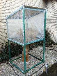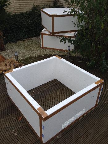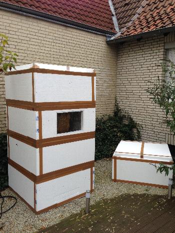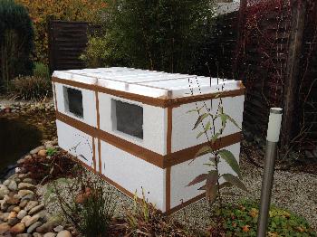 Hier nun nach einigen misslungenen Versuchen (s.u.) meine optimale, platzsparende und günstige Variante meines Winterschutzes. Erstmalig habe ich diesen im Winter 2013/2014 verwendet. Die jeweiligen "Häuser" bestehen aus mit Paketklebeband aneinander geklebten 50cm x 100cm x 6cm Styroporplatten. Das Fester ist eine einfache Plastik-Platte. Um die entstehende Feuchtigkeit abzuleiten habe ich Lüftungsgitter eingeklebt, welche normalerweise für Toilettentüren benutzt werden. Ein weiterer Vorteil ist, dass ich bei entsprechendem Wachstum der Palmen einfach ein weiteres Modul ergänzen kann.